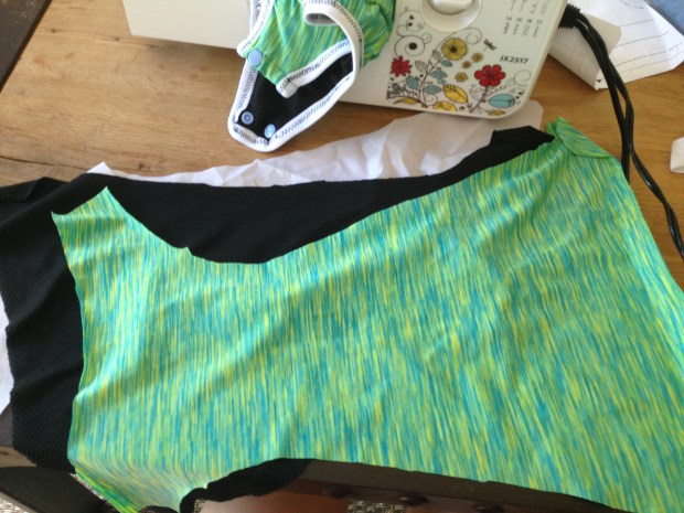 I found this pattern on Sew Mama Sew and we went on a trip to the fabric store after swim class one day. Couldn’t find any PUL material, so went for the ripstop nylon option. Got swim fabric (that the little one got to pick himself), and some black wicking jerset, plus fold-over elastic. It took a couple of tries, but I finally figured out how to get all the layers to stay together while sewing. Once I had that figured out, it was a really quick finish.