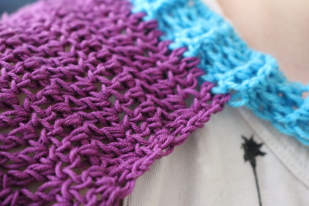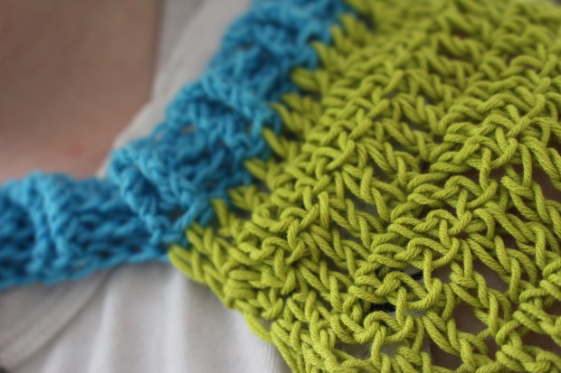 Unfortunately, I didn’t bother to weigh anything, so I can’t tell you specifics. But what I can tell you is the sleeves themselves are crocheted in DMC Natura cotton and the cuffs and collar are Knit Picks Stroll Brights. The collar and cuffs are shortened slightly, just because I was using stash yarn and ran out of the blue in the middle of a round, so I shortened the cuffs to match.