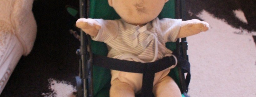 Bebe, the soft doll the boys have, came in a stroller. It matched his pajamas and was perfectly sized for a small child to push around the house/neighborhood. What it wasn’t perfectly sized for was a four-year-old plopping his rear in it and pulling himself around the house. So it has needed some surgery for a couple years.